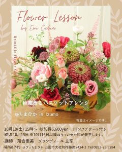 Workshop IN カフェ ちまひか 出雲 2024「秋風香るバスケットアレンジ」 毎月開催しておりますお花ワークショップ IN ちまひか 出雲のお知らせです。10月19日は秋のバスケットアレンジです。 詳細はBlo […]