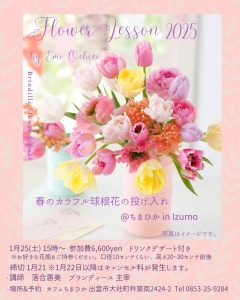 Workshop @ カフェ ちまひか IN 出雲 2025「春のカラフル球根花の投げ入れ」 1月~2月は沢山のチューリップやラナンキュラスなどの球根花が花市場に並びます。 今月のレッスンは東京の大田市場から可愛いお花た […]