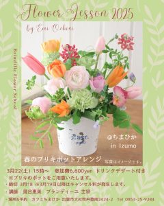 Workshop @ カフェ ちまひか IN 出雲 2025 春のブリキポットアレンジ 毎月開催しておりますお花ワークショップ @ ちまひか IN出雲のお知らせです。3月のレッスンは春のお花たちをナチュラル雑貨にアレンジ […]