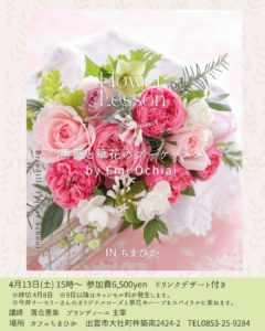 毎月開催しておりますお花ワークショップ IN ちまひか 出雲のお知らせです。2月はチューリップやラナンキュラスなどパステルカラーの春の球根花 投げ入れレッスンです。 詳細はBlog でご確認ください♪https://am […]