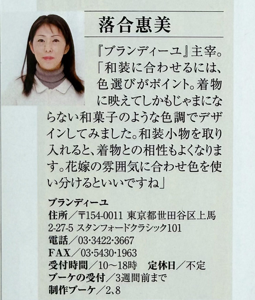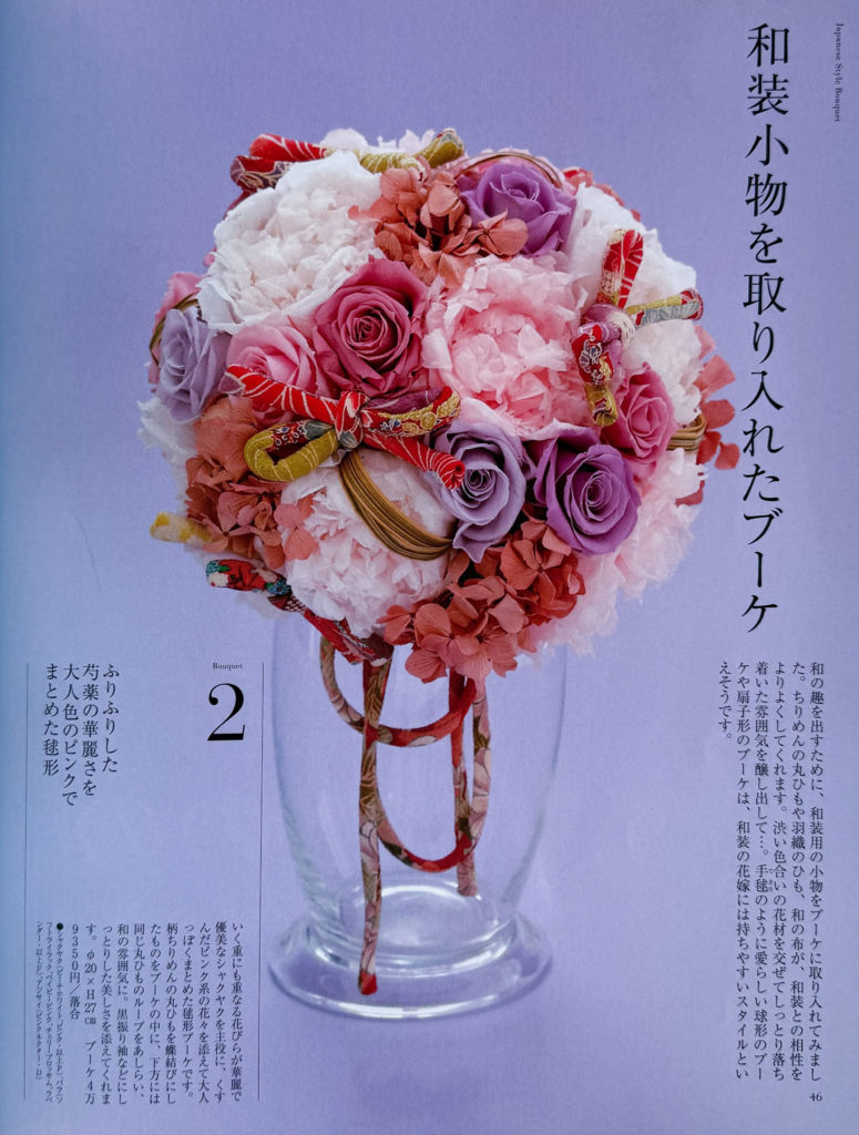 花時間プ*リ*ザVol.3 株式会社角川マガジンズ2009年2月1日発行 2009年2月1日 最終更新日時 : 2025年7月3日 落合 惠美 和装用ブーケ2点担当させていただきました。 Bouquet 2 芍薬のブーケ Bouquet 8 菊のブーケ 花・落合惠美 撮影・山本正樹 FacebookXBluesky
