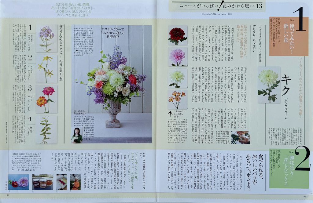花時間2010[1月号](株式会社角川マガジンズ)2010/1/7発行 2010年1月7日 最終更新日時 : 2025年5月18日 落合 惠美 ニュースがいっぱい ! 花のかわら版を担当させていただきました。 キク 「ゼンブラライム」を使用したアレンジと新しい花をピックアップ 花・落合惠美 撮影・瀧岡健太郎 FacebookXBluesky